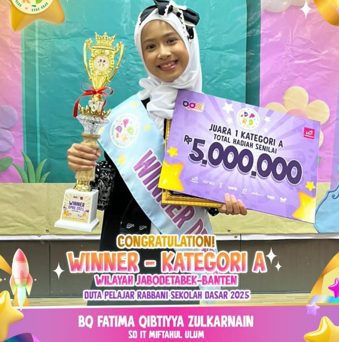 sidikfokusnews.com-Depok.— Prestasi membanggakan kembali ditorehkan oleh peserta didik SDIT Miftahul Ulum Cinere, Depok. BQ Fatima Qibtiyya Zulkarnain, siswi kelas 3D yang sudah hafal 2 juz ini dikenal cerdas dan berakhlak lembut, berhasil meraih Juara 1 Kategori A dalam ajang Grand Final Duta Pelajar Rabbani Sekolah Dasar (DPRD) 2025 yang diselenggarakan oleh Rabbani Group, Minggu (26/10/2025). Kompetisi ini menjadi ajang bergengsi tingkat nasional bagi pelajar sekolah dasar untuk menampilkan bakat, prestasi, dan karakter Islami terbaik.