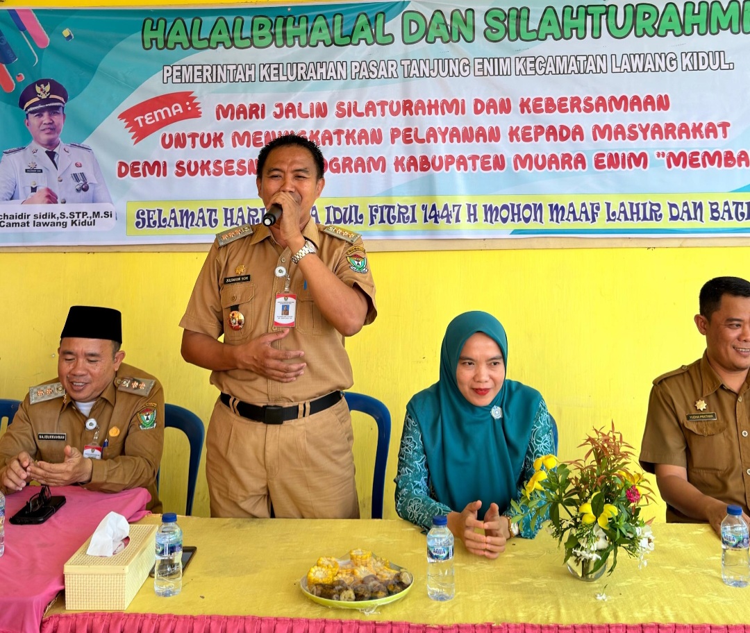 sidikfokusnews.com. Tanjung Enim — Pemerintah Kelurahan Pasar Tanjung Enim, Kecamatan Lawang Kidul, Kabupaten Muara Enim, menggelar kegiatan halal bihalal dan silaturahmi yang sarat makna kebersamaan serta penguatan koordinasi lintas sektor. Kegiatan yang berlangsung di Aula Kantor Lurah Pasar Tanjung Enim pada Selasa (7/4/2026) ini menjadi momentum strategis untuk mempererat hubungan kelembagaan sekaligus menyatukan langkah dalam meningkatkan kualitas pelayanan publik.