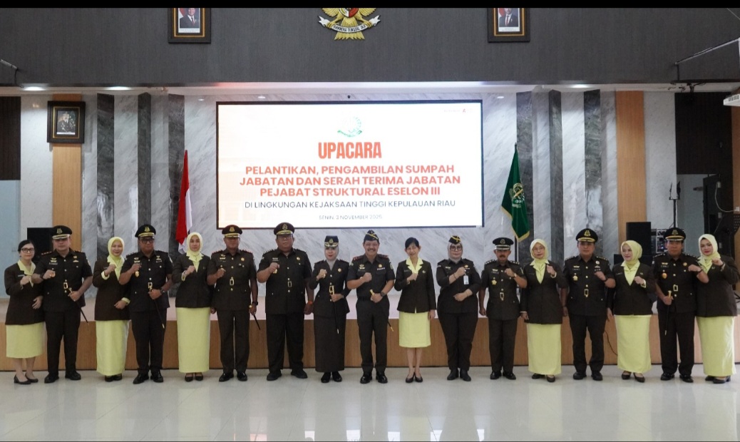 sidikfokusnews.com-Tanjungpinang.– Kepala Kejaksaan Tinggi Kepulauan Riau (Kajati Kepri) J. Devy Sudarso memimpin upacara pelantikan, pengambilan sumpah jabatan, dan serah terima jabatan pejabat struktural eselon III di lingkungan Kejati Kepri. Kegiatan berlangsung khidmat di Aula Sasana Baharudin Lopa, Senin (21/7/2025).