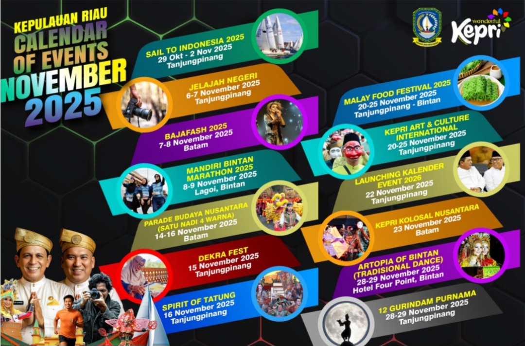 Menjelang akhir November, Pemprov Kepri juga akan meluncurkan Kalender Event Kepri 2026 di Tanjungpinang, diikuti dengan Kepri Kolosal Nusantara di Batam dan 12 Gurindam Purnama di Tanjungpinang — agenda yang diharapkan memperkuat diplomasi budaya maritim Indonesia di mata dunia.