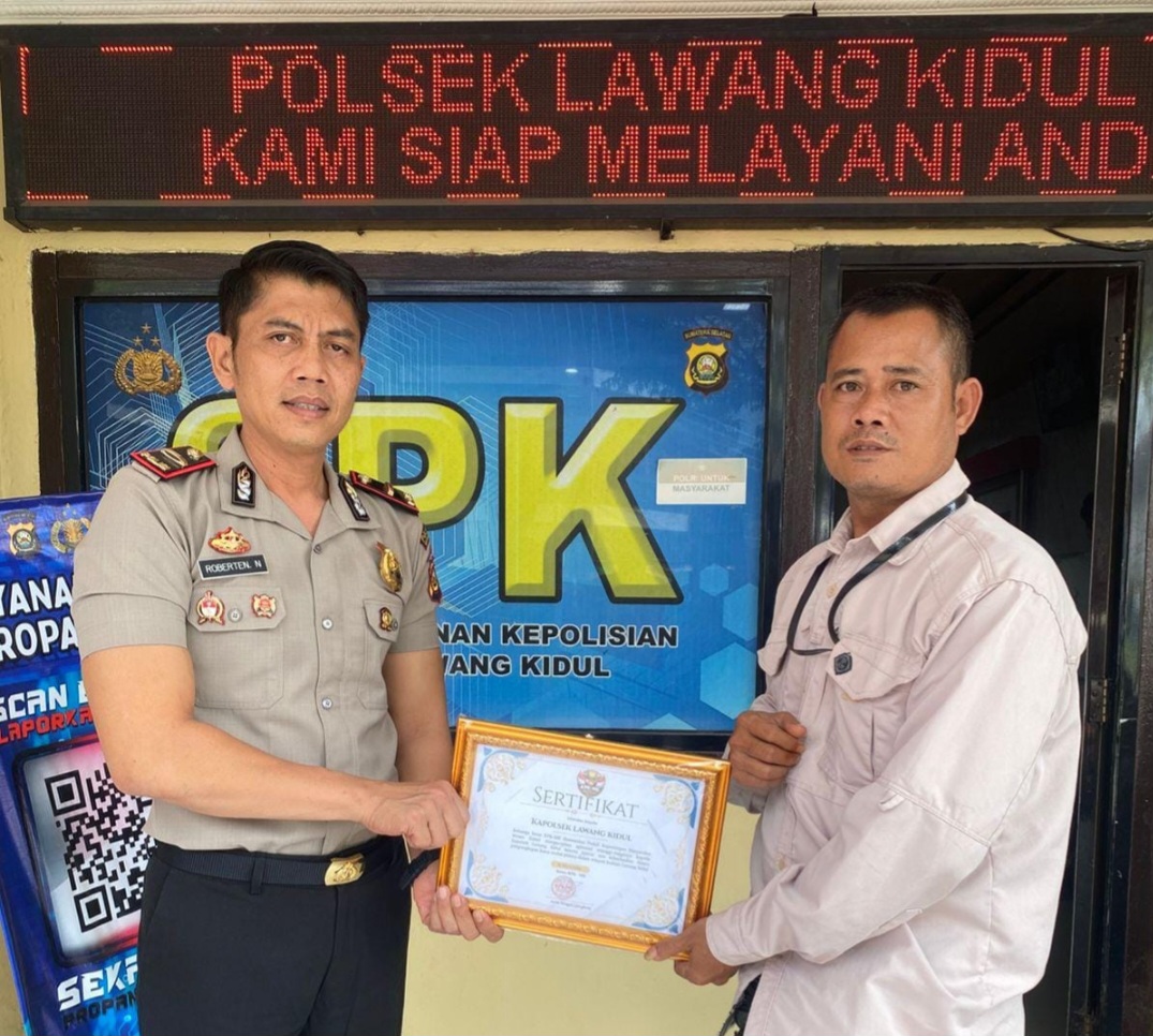 Penghargaan tersebut diwujudkan melalui penyerahan sertifikat apresiasi yang dilakukan dalam suasana hangat dan penuh kebersamaan. Meski tidak diserahkan langsung oleh Ketua KPK-ME, Amat Nangwi Jangkuk, prosesi tetap berlangsung khidmat melalui perwakilan anggota organisasi. Dari pihak kepolisian, kegiatan ini dihadiri oleh Wakapolsek Lawang Kidul, Ipda Roberten, yang mewakili Kapolsek Iptu Zakwan Rifqi, S.TR.Ka., serta Kanit Reskrim Ipda Jerry yang dikenal aktif dalam penanganan berbagai perkara di tengah masyarakat.
