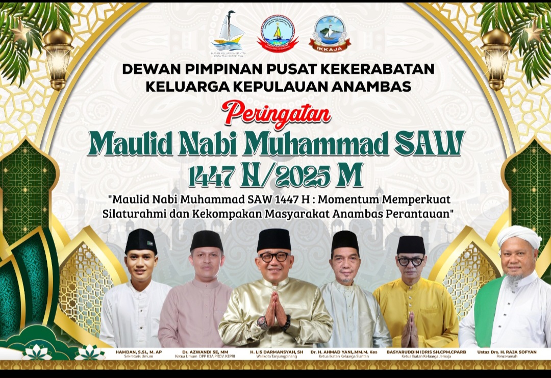 sidikfokusnews.com-Tanjungpinang.– Perantau asal Anambas di Kepulauan Riau kembali membuktikan bahwa ikatan persaudaraan tidak pernah bisa diputus oleh jarak. Melalui acara Maulid Nabi Muhammad SAW 1447 Hijriyah, DPP-K3A Provinsi Kepri bersama Ikatan Keluarga Siantan (IKS) dan Ikatan Keluarga Jemaja (IKKAJA) sepakat menggelar peringatan hari lahir Nabi Besar Muhammad SAW di Aula Mini Asrama H, Minggu 14 September 2025, pukul 08.00 WIB hingga selesai.