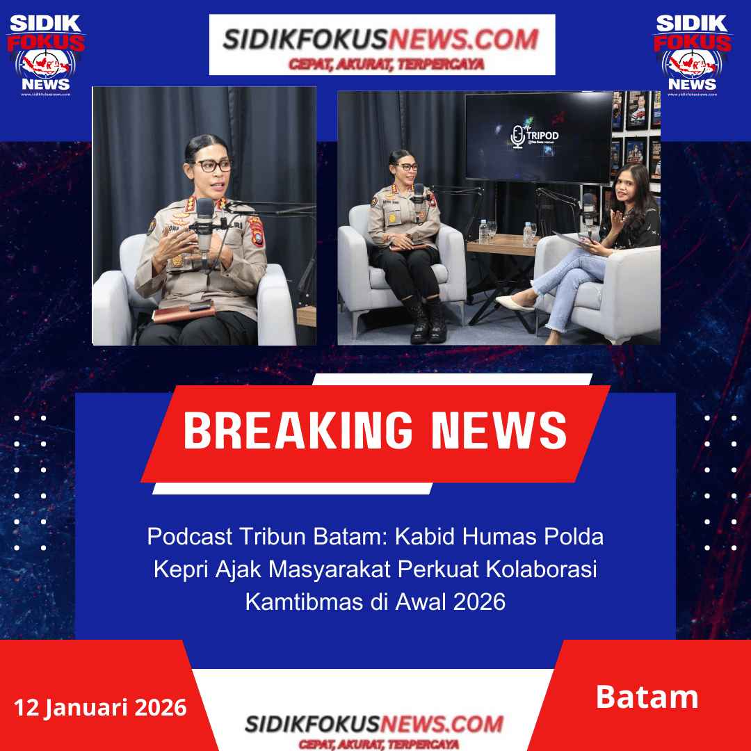 SIDIKFOKUSNEWS| Batam 12 Januari 2026— Kepala Bidang Hubungan Masyarakat Polda Kepulauan Riau, Kombes Pol. Dr. Nona Pricillia Ohei, S.I.K., S.H., M.H., menegaskan pentingnya peningkatan kualitas pelayanan publik serta penguatan kolaborasi antara Polri dan masyarakat dalam menjaga keamanan dan ketertiban masyarakat (kamtibmas). Hal tersebut disampaikannya saat menjadi narasumber dalam Podcast Tribun Batam bertajuk “Polda Menyapa di Awal Tahun 2026”, Senin (12/1/2026).
