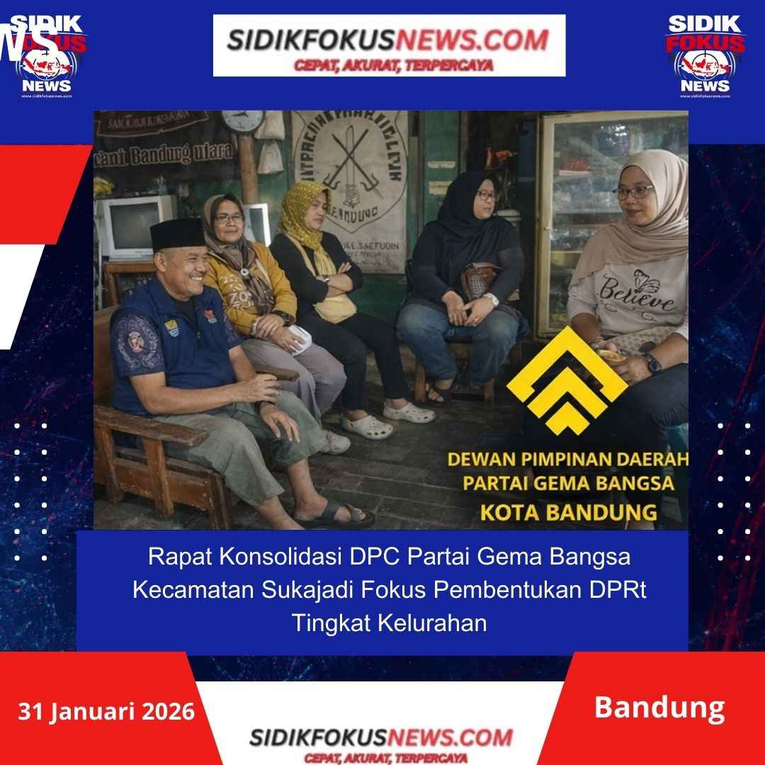 SIDIKFOKUSNEWS|Bandung,31 Januari 2026– Dewan Pimpinan Cabang (DPC) Partai Gema Bangsa Kecamatan Sukajadi menggelar rapat konsolidasi sebagai langkah penguatan struktur organisasi di tingkat bawah. Rapat tersebut dipimpin langsung oleh Ketua DPC Kecamatan Sukajadi, Abah Warbu, dan dihadiri oleh jajaran pengurus serta simpatisan.